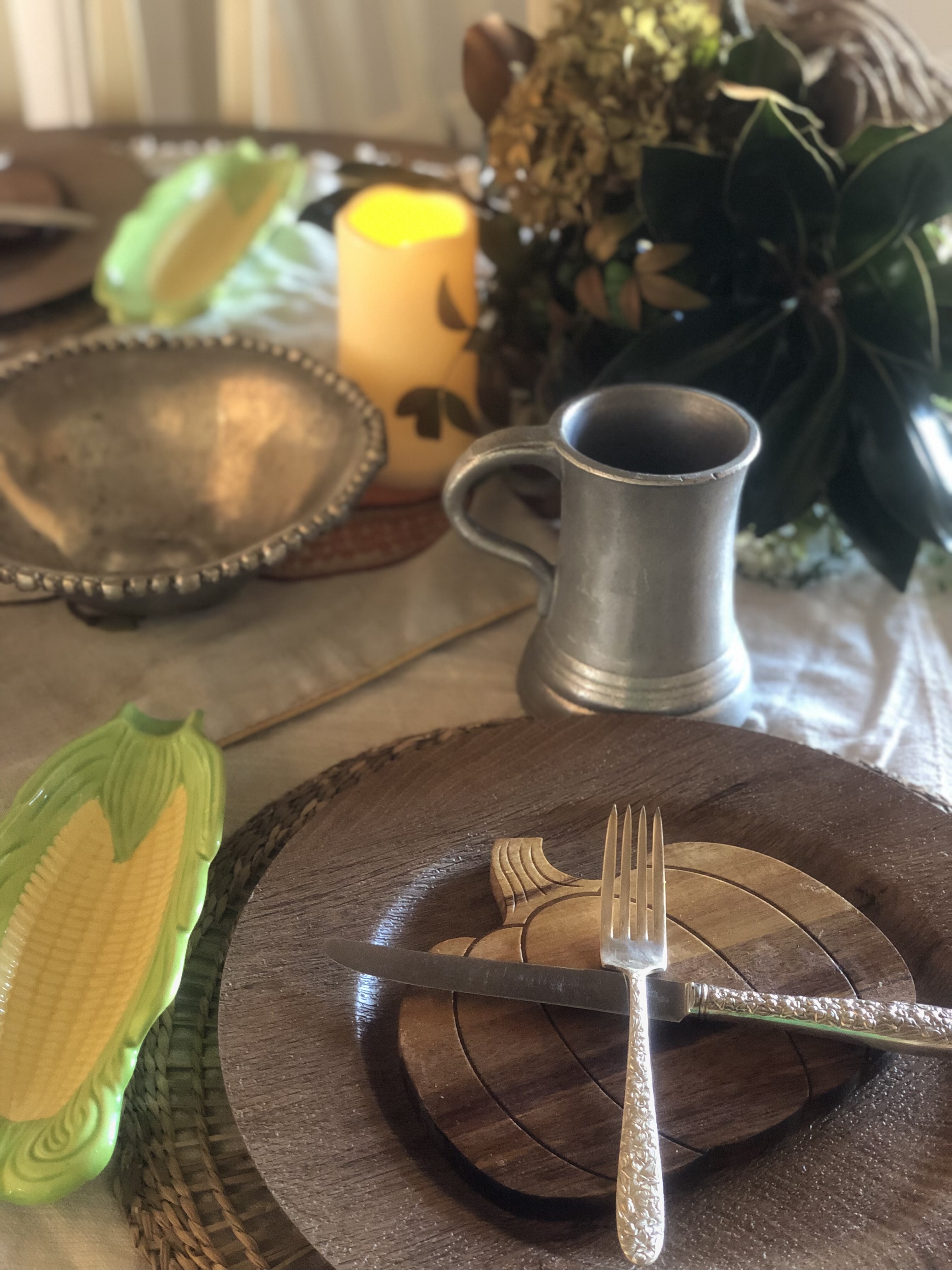 Let everyone help set the table. Go family-style with natural textures—wood chargers, simple linens, fall foliage. Real candles if you dare, battery-operated if your wrecking balls can’t resist blowing them out. I love this centerpiece from American Farmhouse Style, plus these ideas from A Pretty Life and Hallstrom Home.