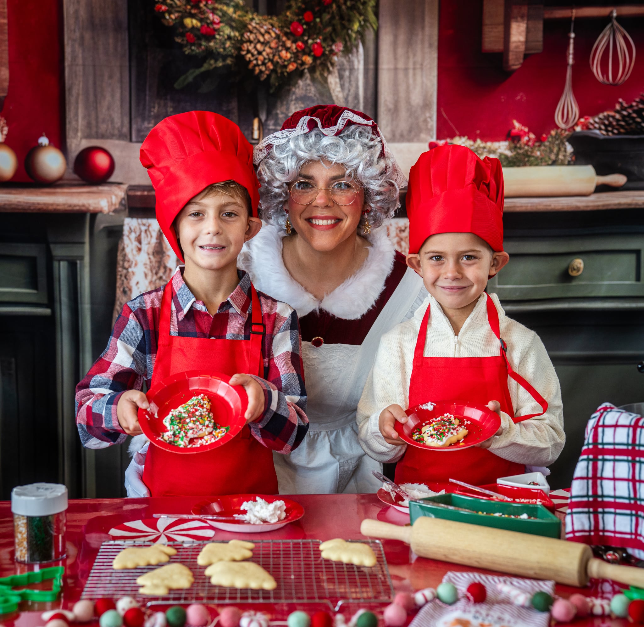 After a mini sleigh photo shoot, the kids dropped their letters into a magical North Pole mailbox, and then we were whisked into Mrs. Claus’ kitchen. She welcomed them like she had waited all year for our children. There were aprons, chef hats, and enough frosting to put someone in a sugar coma. Mrs. Claus had one rule: “Use as many sprinkles as you want.” And trust me, they did.